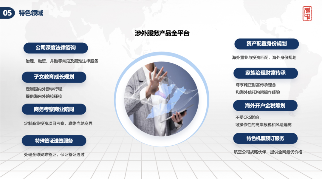 ② 移民法律服务板块,通过汇聚顶尖移民专家团队,提供从“签证申请、身份规划、跨境资产配置、税务筹划”的全周期法律解决方案;
