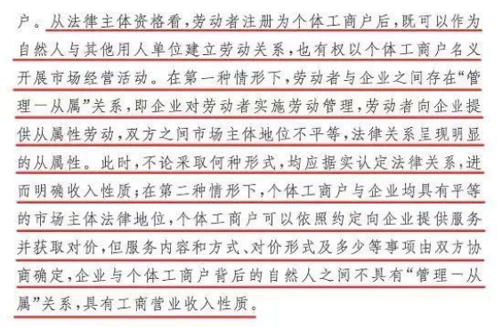 2023 年 7 月,最高人民法院提出:“准确判定新就业形态劳动者的收入性质是经营所得还是劳务报酬所得,是保障该群体匹配合理税收政策的关键点之一,建议出台司法解释,准确判定新就业形态劳动者经济活动实质。”同时指出:应当通过用工法律关系以此明确区分劳动者收入性质。即若认定为劳动关系,则属于劳务报酬所得;若认定为平等市场主体之间的民事关系,则可能属于经营所得。即在网络直播的活动中,主播取得的收入的性质,首先以其与用工单位之间的用工关系是否具有从属性来判断。如果是具有从属性的用工关系,则认定为劳务报酬。如果不具有从属性,而是平等的民事关系,再根据服务内容判断是否属于经营所得。