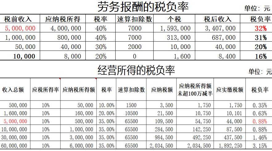 同样税前收入500万元时,劳务报酬需缴纳个税159万元,税负率32%,而经营所得需缴纳个税4.4万元,税负率0.88%,纳税人则增加税后收入155万元。