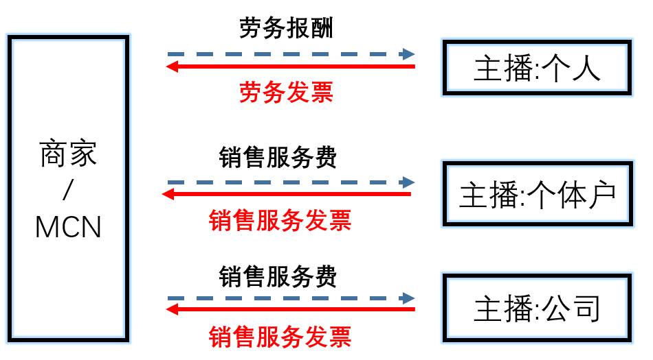 带货在直播平台注册的账号主体,主体形式有三种:个人、个体工商户、公司。但不管主播用哪种类型,数量上只有一个。按不同主体的收入性质不同,开票类型不同,如下图: