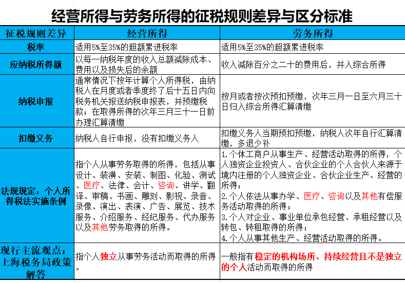 两者最本质的区别:经营所得指自然人、个体户从事生产经营活动取得的所得,而劳务所得是自然人为公司或个体工商户提供劳务取得的所得。同样税前收入,两种所得的税负率对比,如下表: