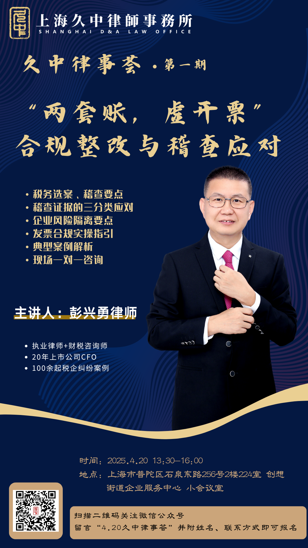 2025 年 4 月 20 日,上海久中律师事务所在上海市普陀区街道企业服务中心举办了久中律事荟第一期专题讲座 《“两套账,虚开票” 合规整改与稽查应对》。本次活动由彭兴勇律师主讲,聚焦企业税务合规的关键问题,吸引了众多企业管理者、财务人员和法务人员参加。