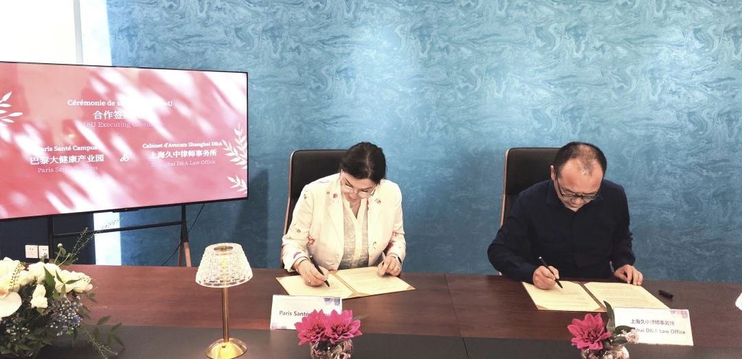 上海久中律师事务所与法国国家级数字健康创新平台巴黎大健康园区Paris Santé Campus主席 Clémentine Langlois 女士签署了《跨境法律服务与产业协同合作备忘录》。
